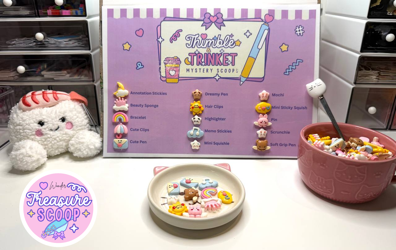 When you purchase a Mystery Scoop, you are buying a curated box of surprise items selected by Thimble and Trinket. The contents are chosen at random from a wide range of products, including stationery, plush toys, lifestyle items, self-care treats, and themed trinkets. Each scoop is unique and will vary from order to order. The capsule balls themselves are opened on camera and are not shipped in your order.